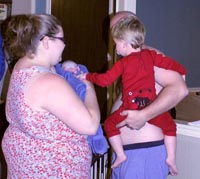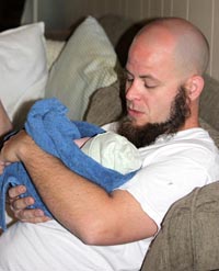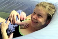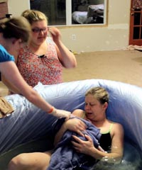 5:08 am: Midwife Chris Duffy arrives with her assistant Ashley. Sometime around this time Sandy, a fellow midwifery student, arrives to take pictures for us. They stayed out in the living room and I was still in the bedroom so I was a little disconnected to the activity going on. Finally, someone said that there was enough water in the birth pool if I felt like moving out there. I had your Aunt Bonnie help me get a different top on and put my hair in a pony tail… all VERY slowly so as not to break the water! Contractions were coming almost back to back and I somehow found the coordination to get into the living room and into the pool. Once in, I lay down on my side and used the built in seat with a rolled up towel as a head rest. Your Daddy remembered that I kept complaining I was going to drown when your brother was born so he did not fill the water very high, it was perfect. However, we weren’t to enjoy it for long J