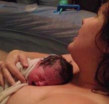 At 5:27 am, I delivered the most beautiful baby girl I could ever have dreamed of. And instead of being 11 pounds, she was 8 pounds and 10 ounces. Afterwards, I held my baby without anyone trying to take her from me. When I was ready, my partner cut the cord and held his daughter while Chris helped me to deliver the placenta. Then I got out of the pool, dried off and got in to my own bed.